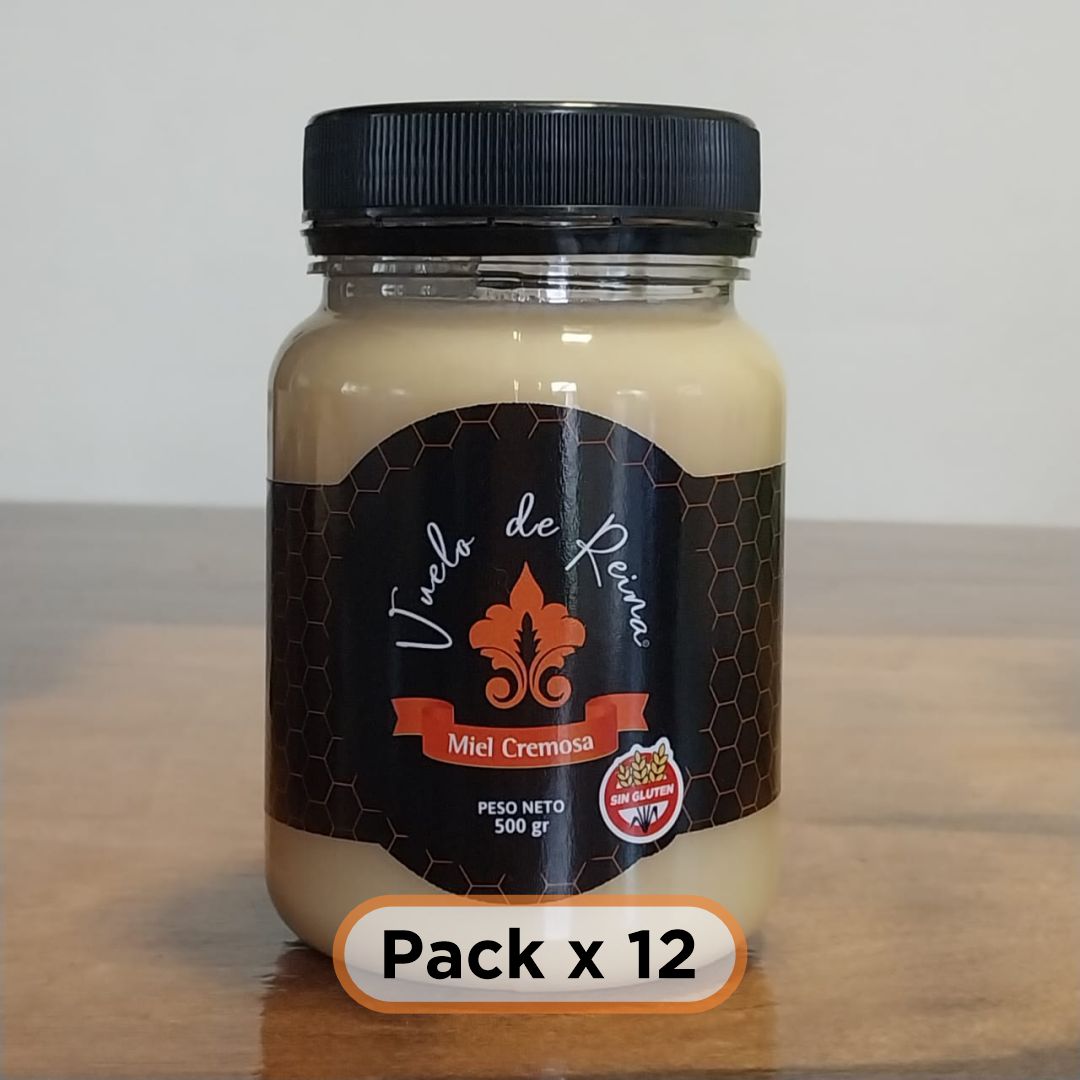 Pack de 6 unidades de Miel cremosa 100% natural, con certificación sin gluten, con proceso de batido artesanal. Ideal para untar en desayunos y meriendas, agregar a postres y gastronomía en general.