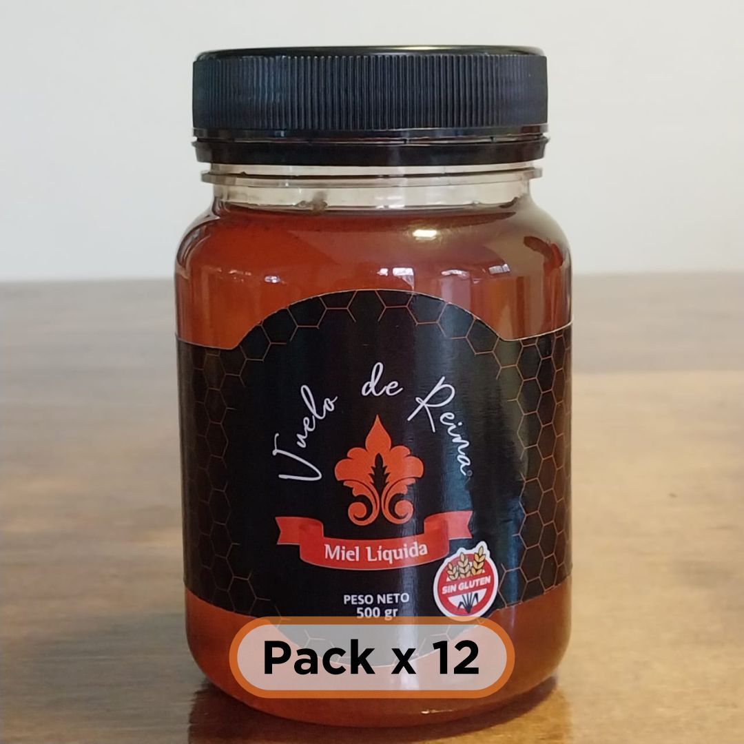 Pack de 12 unidades de Miel líquida 100% natural, con certificación sin gluten. Ideal para cocinar, agregar a salsas e infusiones frías y calientes, elaboración de hidromiel.
