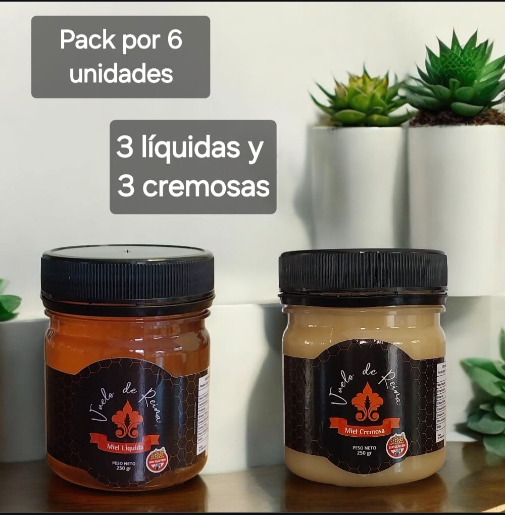 Pack de 6 unidades de Miel líquida 100% natural, con certificación sin gluten. Ideal para cocinar, agregar a salsas e infusiones frías y calientes, elaboración de hidromiel.